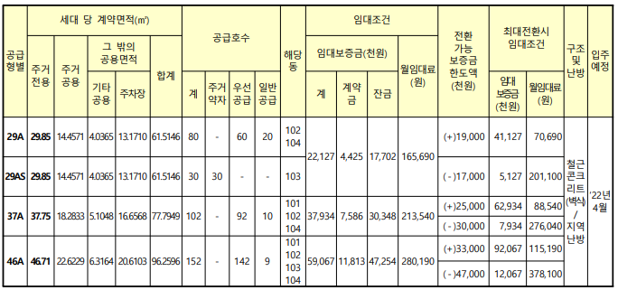 • 위 임대조건의 임대보증금 및 월임대료는 입주자모집공고일 현재 기준이며, 예비입주자로 선정된 분은 추후 공가가 발생하여 임대차계약을 체결하게 되는 시점의 변경된 임대조건이 적용됩니다.