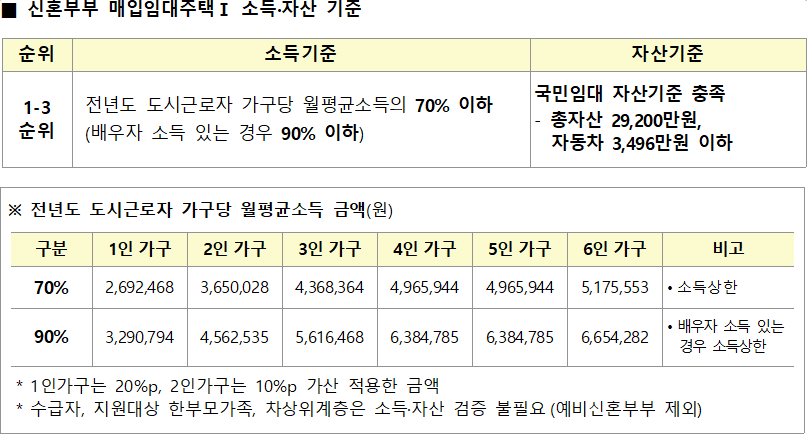 • 공고일 현재 무주택세대구성원으로서 신혼부부 매입임대주택Ⅰ 소득 및 자산기준을 충족하는,