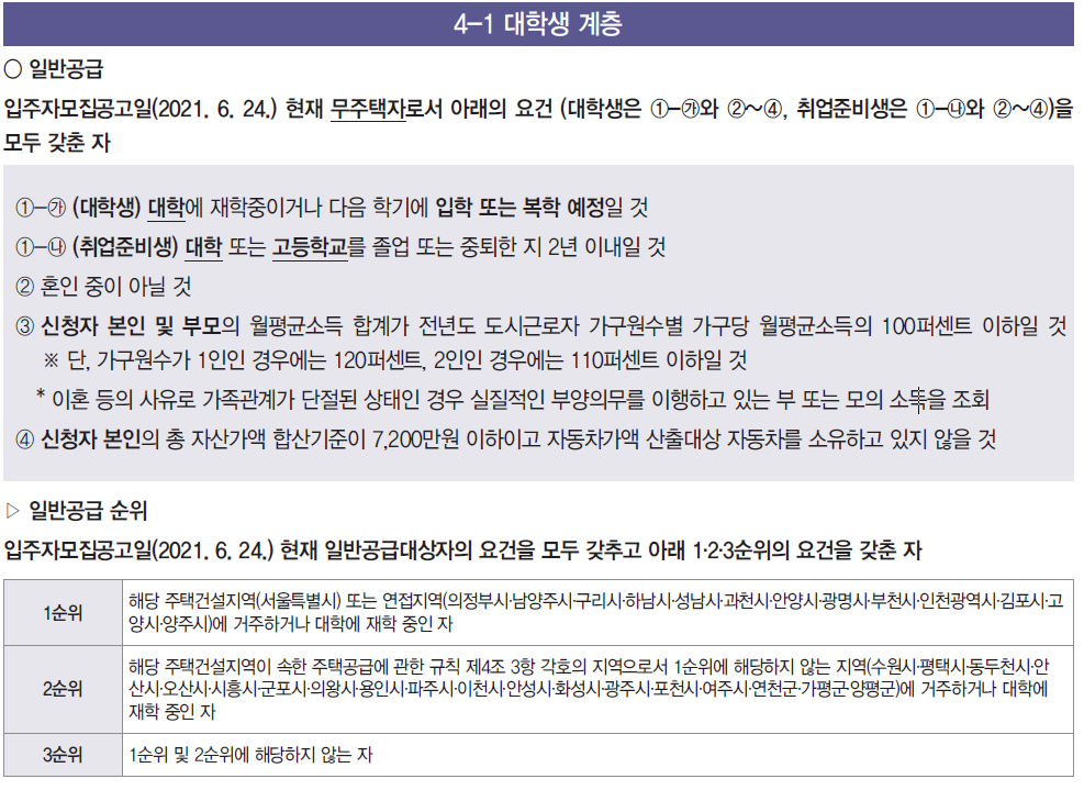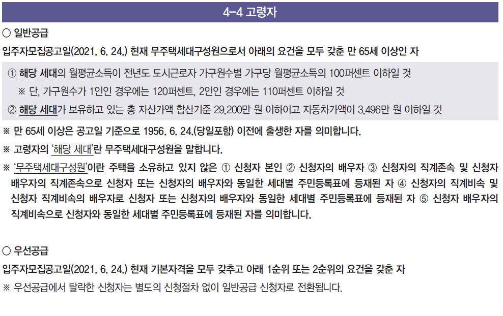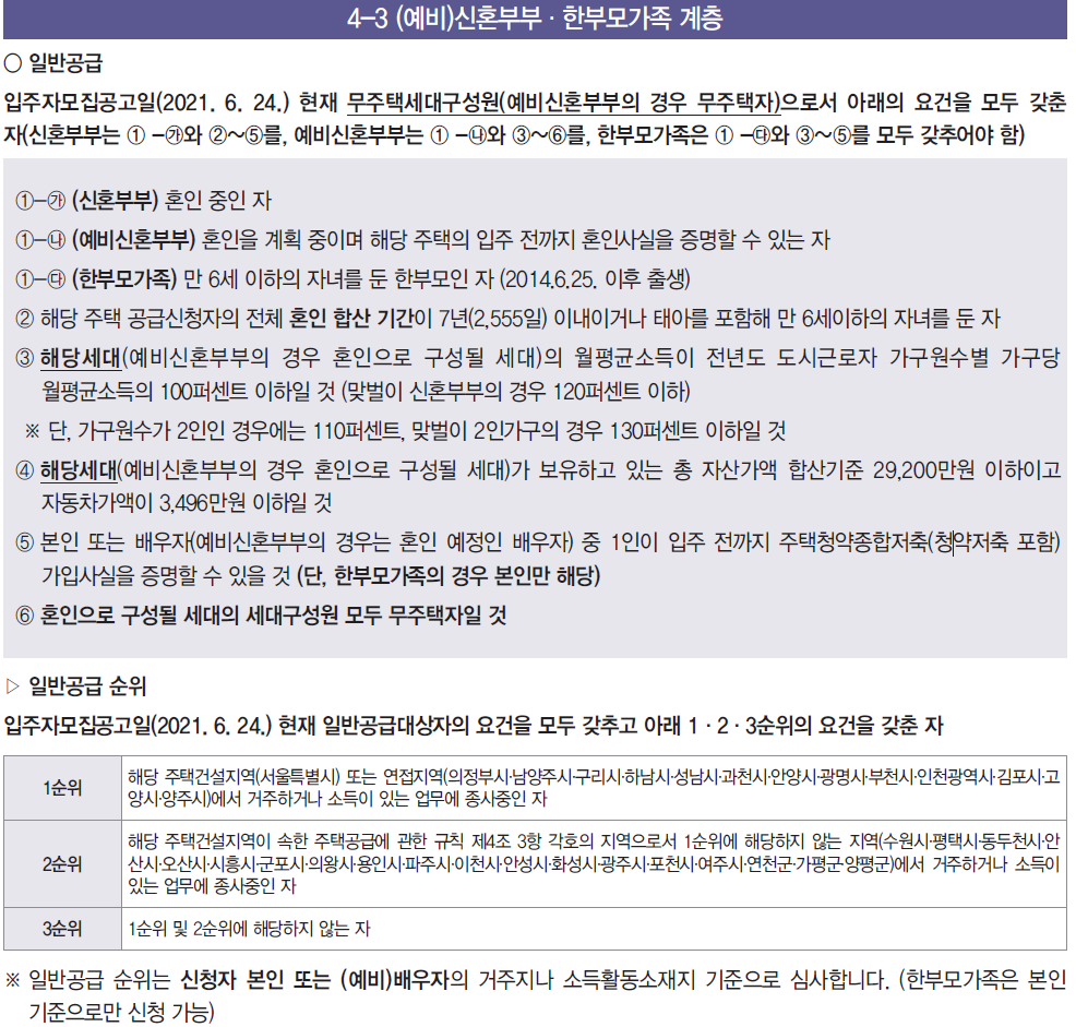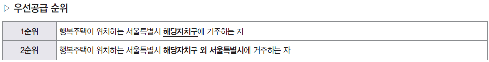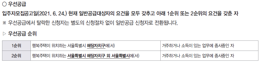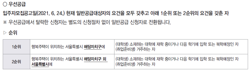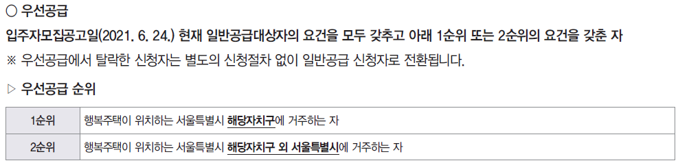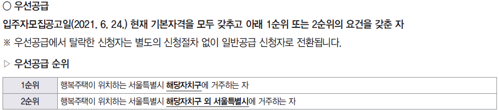 • 우선공급 신청이 미달된 경우 남은 물량은 해당 공급대상별 일반공급 물량으로 전환해 공급합니다.