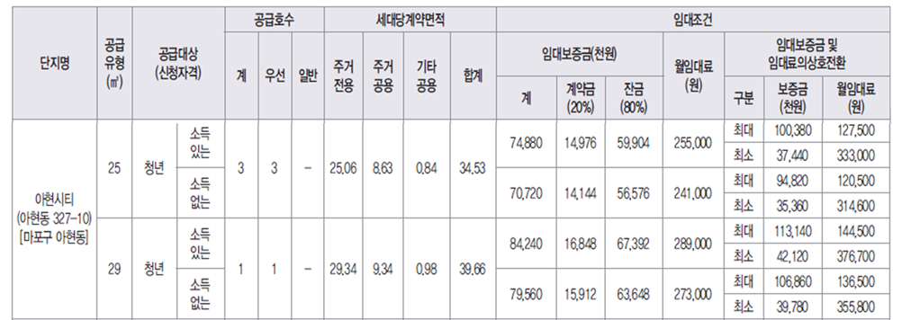 • 소득이 없는 청년 계층 신청자는 동일 신청유형의 대학생 계층의 임대조건이 적용됩니다. 각 평형별로 타입 구분 없이 임대보증금 및 임대료는 동일합니다.