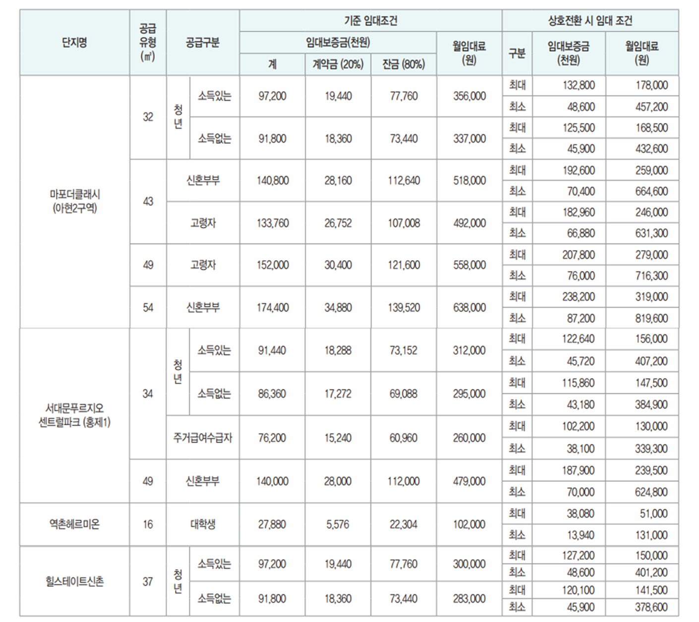 ◦ 상호전환 적용 금액: p43. [별표1] 임대금액 상세 안내 참고