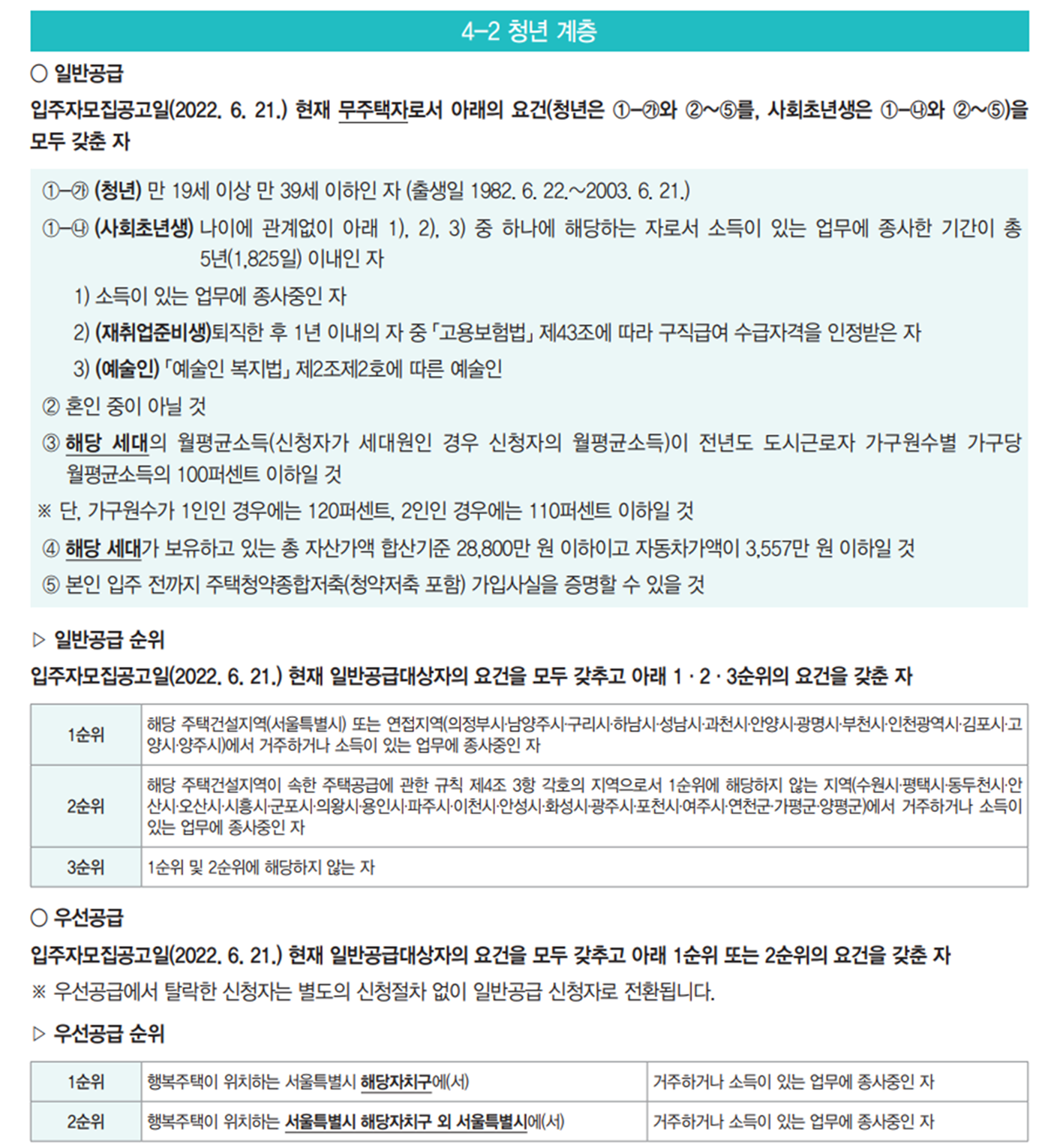 ※ 사회초년생 중 재취업준비생의 경우 공고일 기준으로 퇴직한 상태이므로 우선공급 및 일반공급 순위를 ‘거주지’ 기준으로만 신청할 수 있으며, 이 경우 청약신청 시 ‘소득없음’으로 체크하여야 합니다.