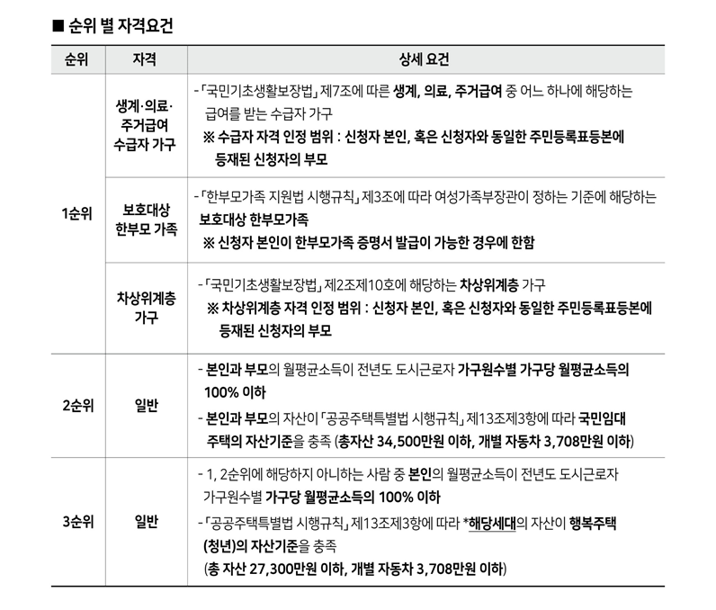 ○ 신청자는 입주자모집공고일(2024. 7. 26.) 현재 19세 이상 39세 이하인 무주택자, 미혼(현재 혼인 상태가 아님)인 청년으로서 신청순위 별 소득, 총자산, 자동차가액 기준을 충족하여야 합니다.