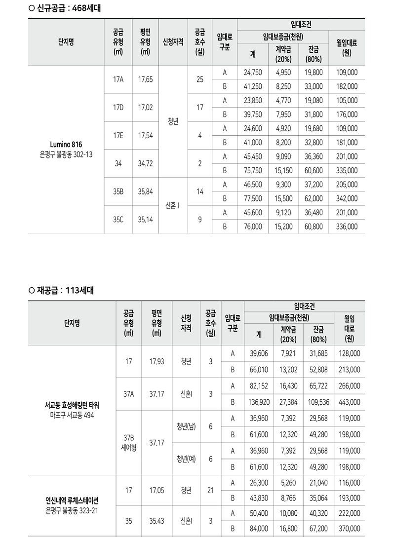○ 신규 공급단지는 청년안심주택 최초 입주자 모집이며, 재공급 단지는 미계약 및 입주 후 퇴거 등으로 발생한 현재 공가를 재공급합니다.