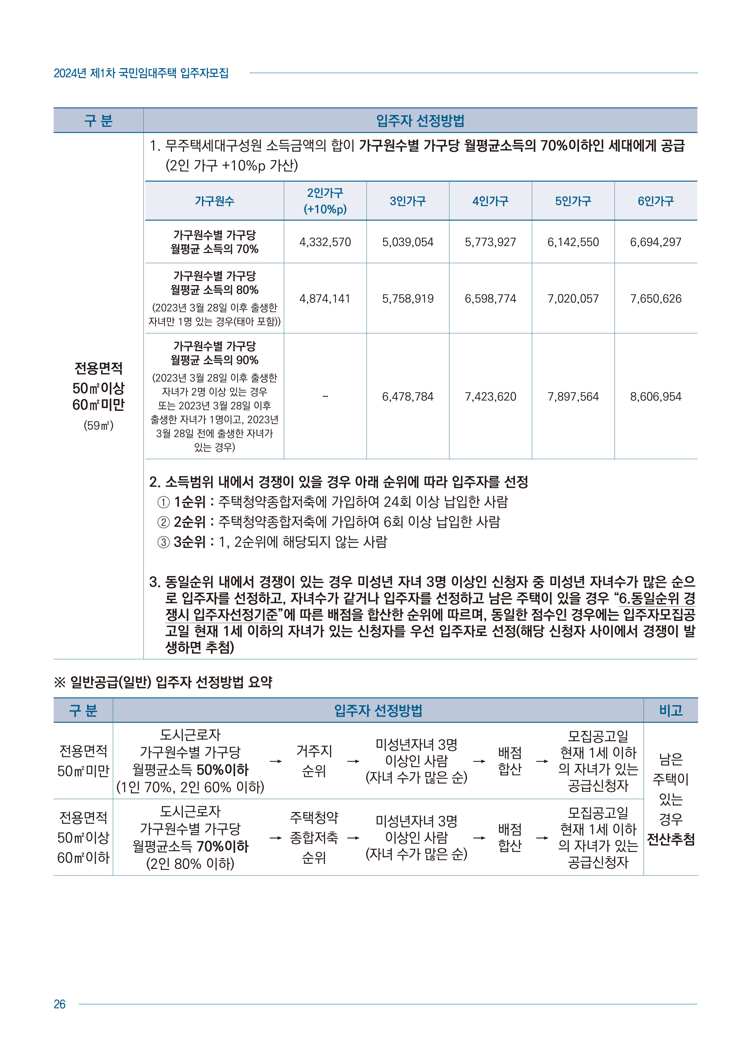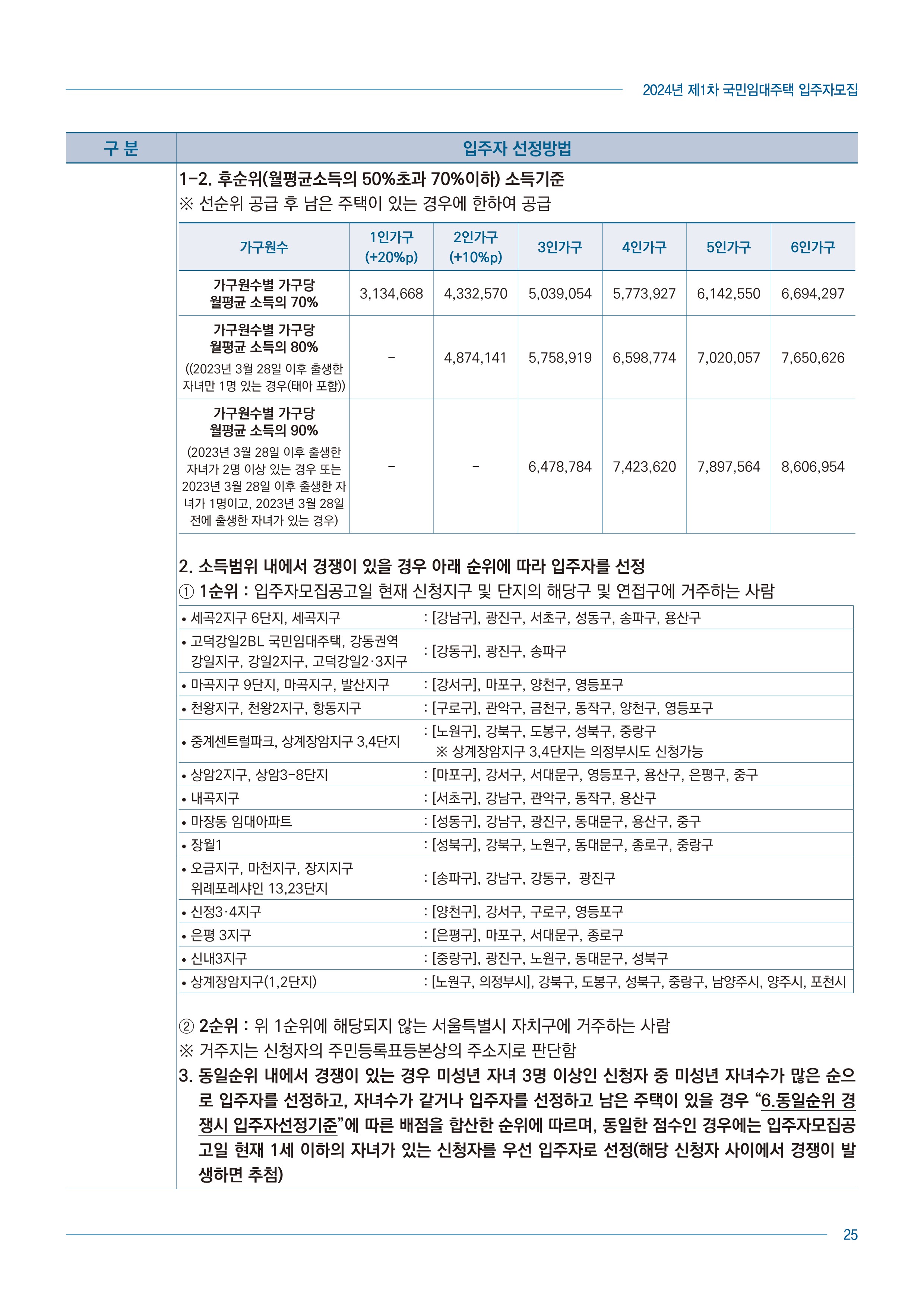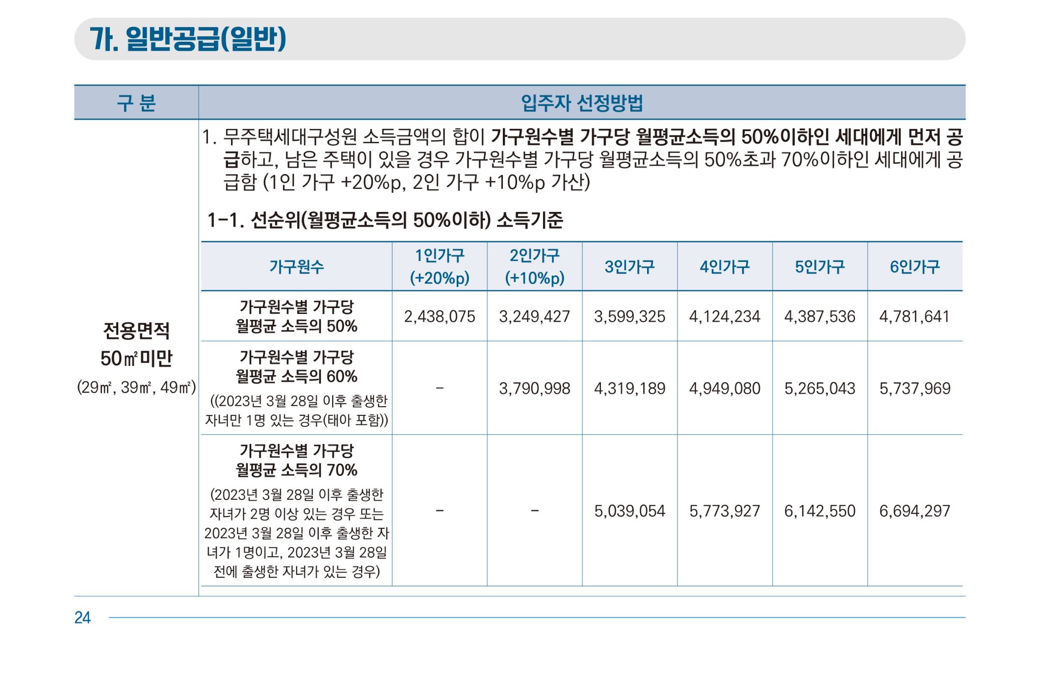 전용면적 50㎡미만: 무주택세대구성원 소득금액의 합이 가구원수별 가구당 월평균소득의 50%이하인 세대에게 먼저 공 급하고, 남은 주택이 있을 경우 가구원수별 가구당 월평균소득의 50%초과 70%이하인 세대에게 공급함 (1인 가구 +20%p, 2인 가구 +10%p 가산)