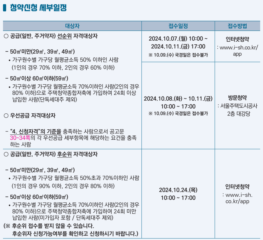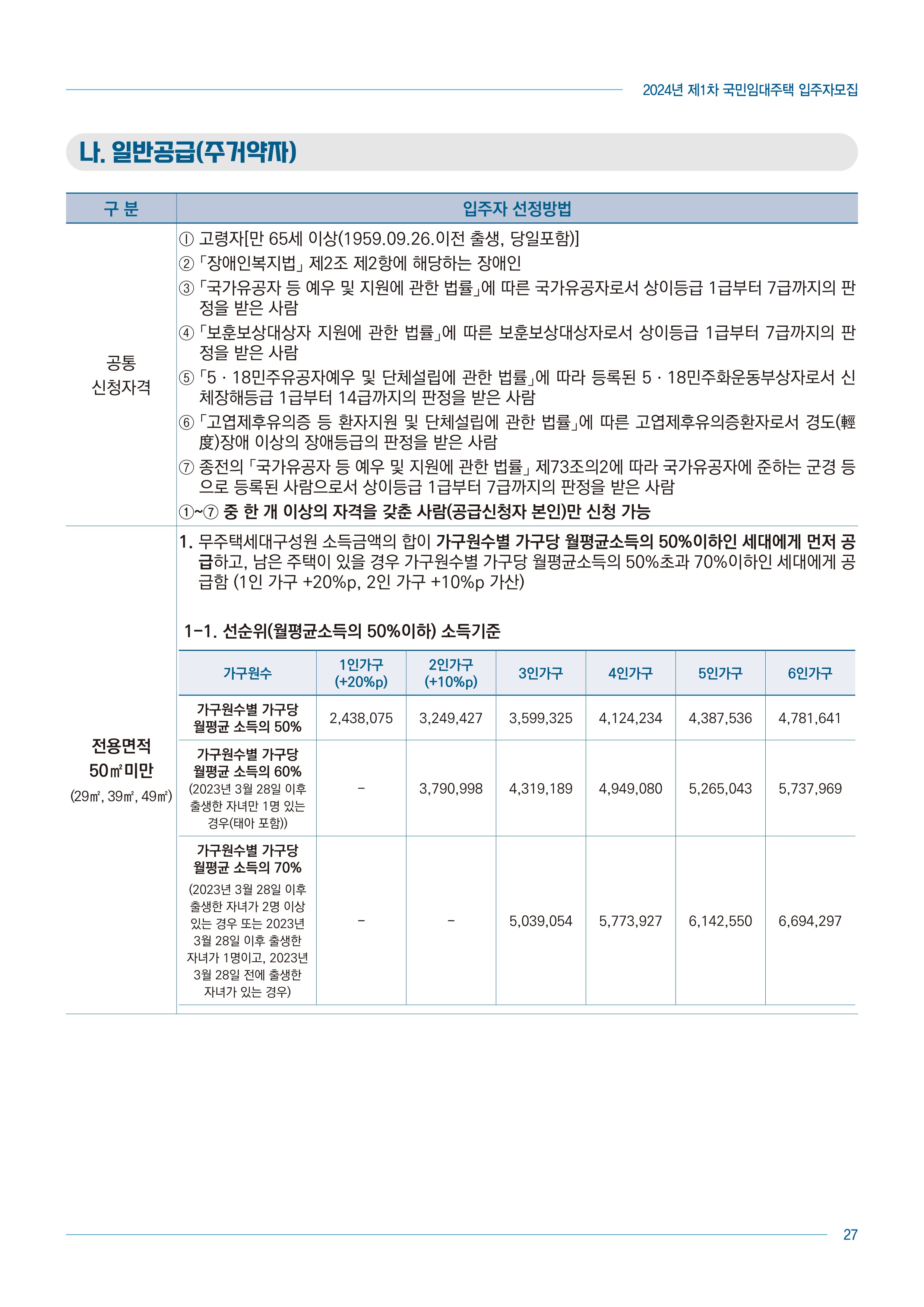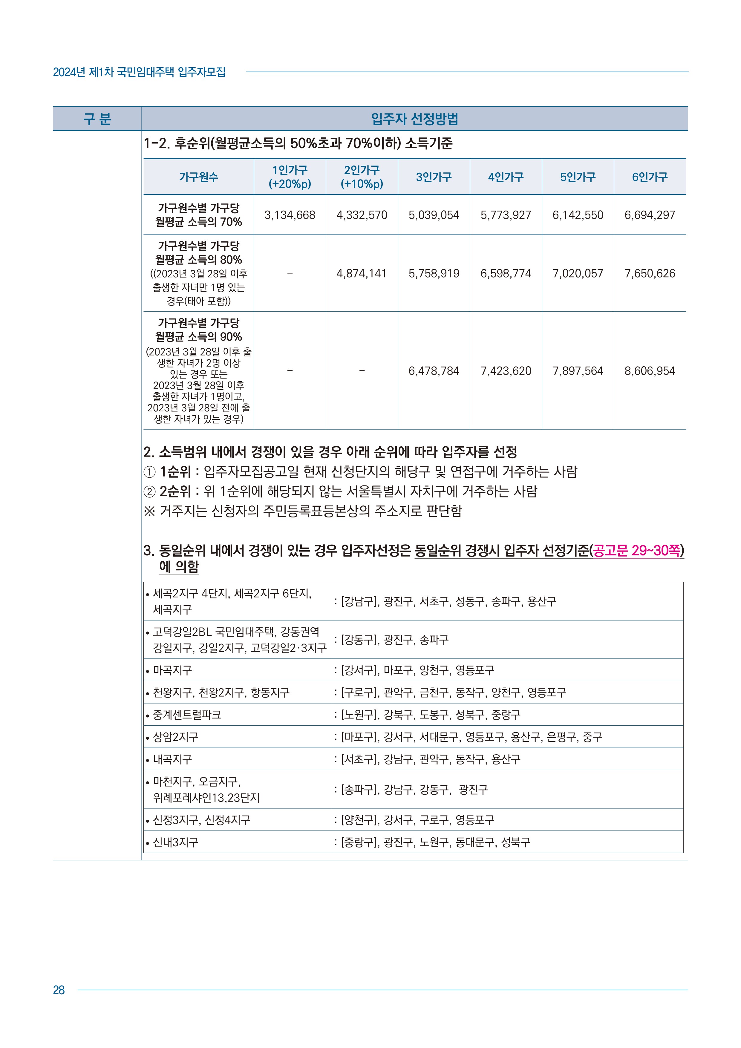 전용면적 50㎡미만: 무주택세대구성원 소득금액의 합이 가구원수별 가구당 월평균소득의 50%이하인 세대에게 먼저 공 급하고, 남은 주택이 있을 경우 가구원수별 가구당 월평균소득의 50%초과 70%이하인 세대에게 공급함 (1인 가구 +20%p, 2인 가구 +10%p 가산)