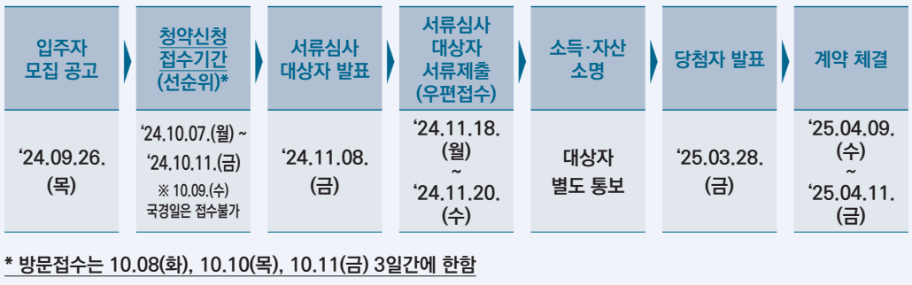 ※ 신규공급 단지(고덕강일2BL 국민임대주택)의 입주 예정일은 준공일정 등으로 인하여 계약체결 후 상세 안내할 예정이며, 재공 급 세대의 입주 예정일은 2025년 4월 이후 예정이나 세대 하자점검 사유 등 공급 보류로 일정이 조정될 수 있으니 참고하시기 바랍니다.